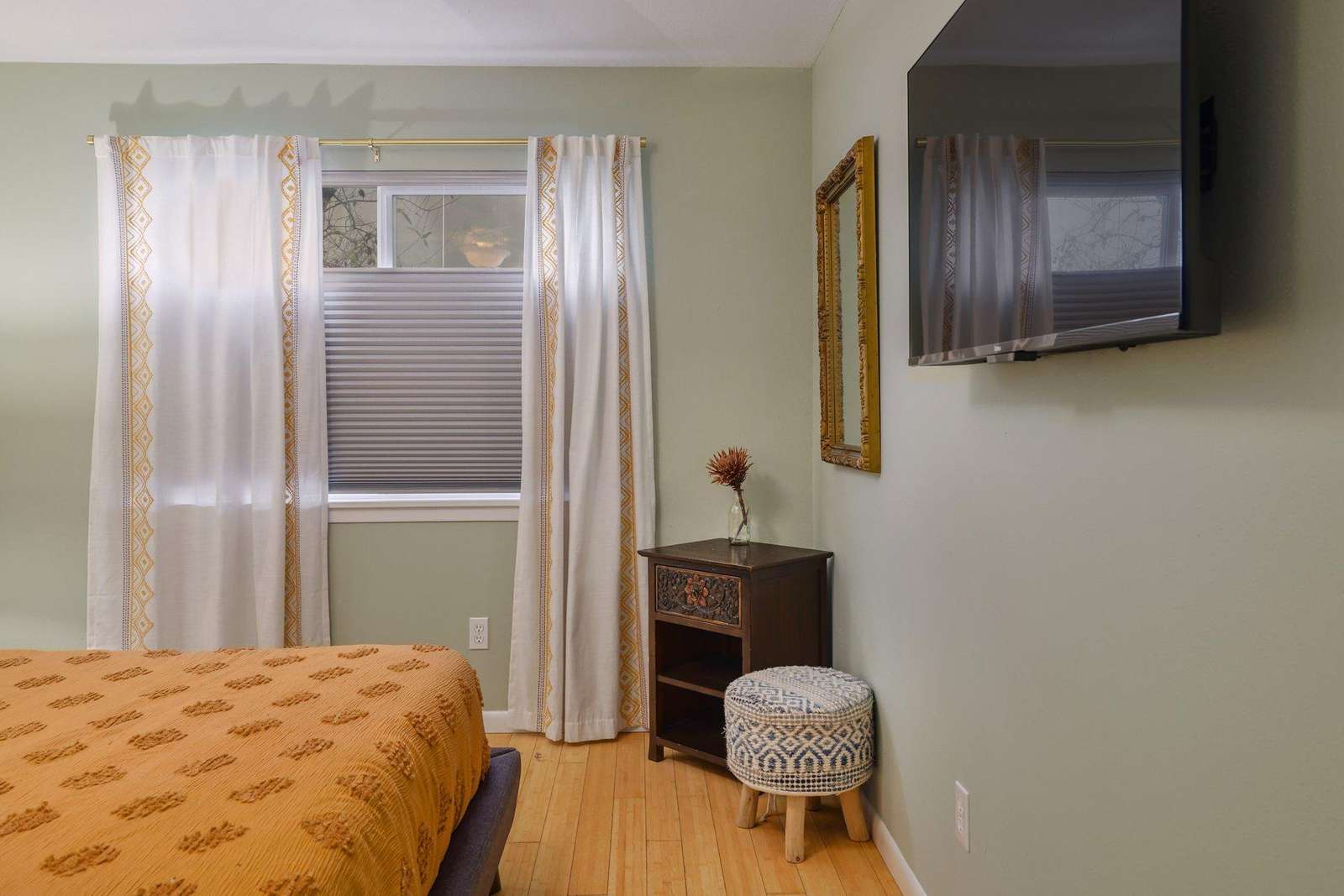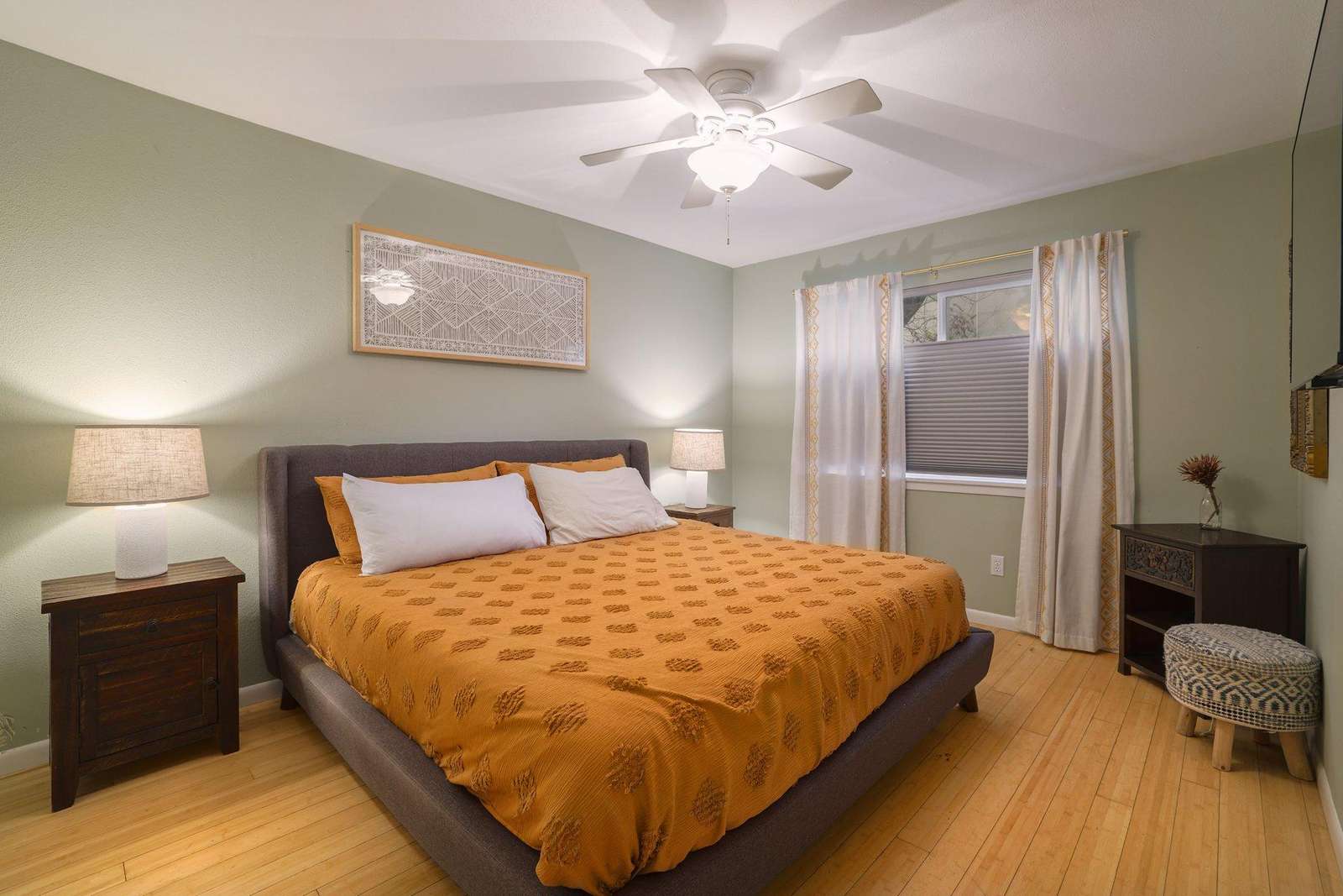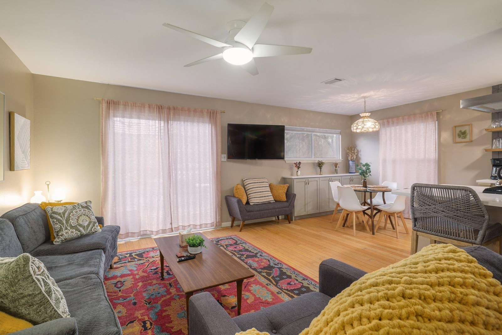 Beautiful two bedroom, one bath with a king bed and queen bed. Sunny living room, beautiful patio , and dining area. Kitchen is fully furnished and there is a fenced front yard in case you bring a pup! Nice big flat screen TV, beautiful modern decor.